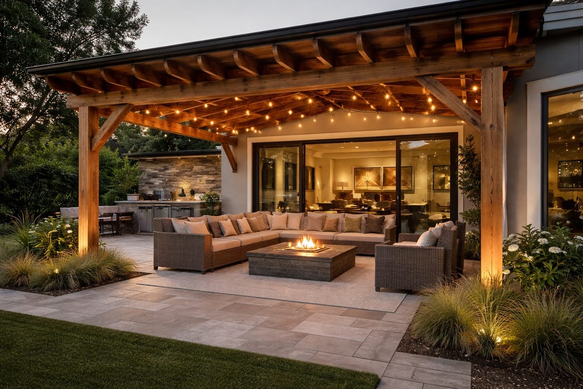 Backyard remodelling including awning structure